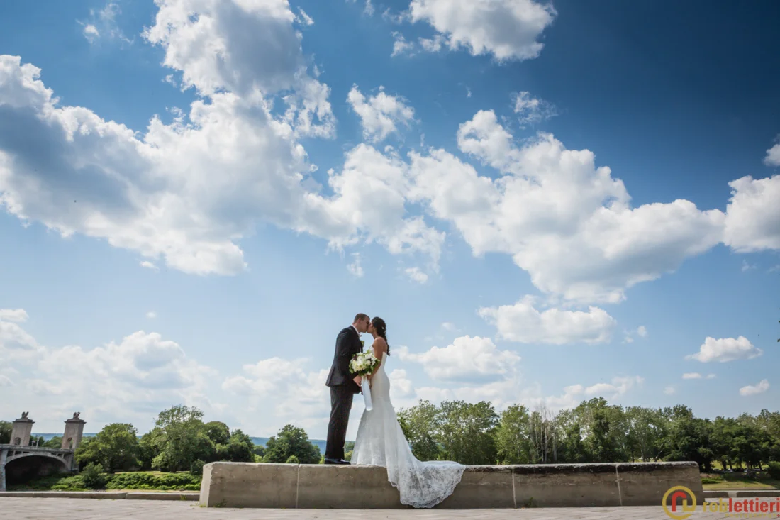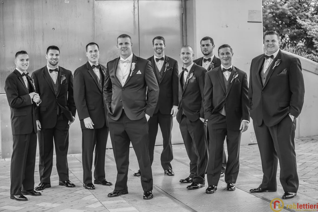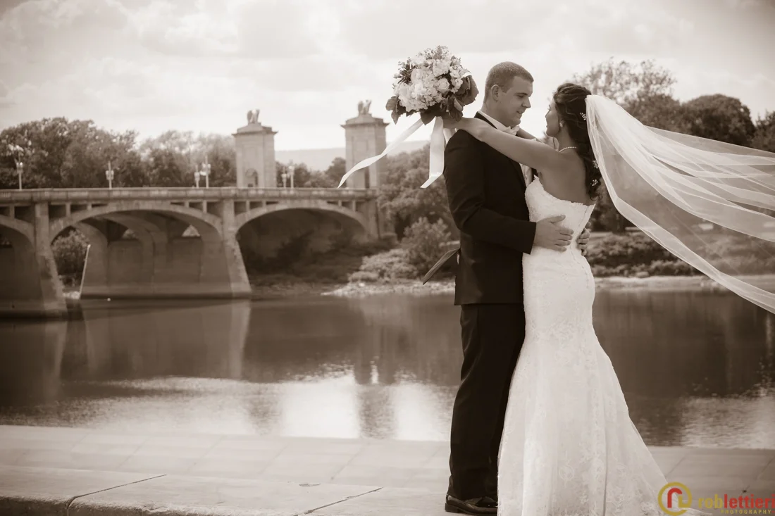Taylor + Gino choose to do a first look at their wedding reception venue, the Westmoreland Club in Wilkes-Barre, PA. Shortly after we headed out with the wedding party to the Millennium Circle along the Susquehanna river for some photographs + fun. Their ceremony took place in the tented area adjacent to the Westmoreland Club followed by cocktails inside. The tent was converted into an elegant reception area where Shorty Long & the Jersey Horns entertained guests.