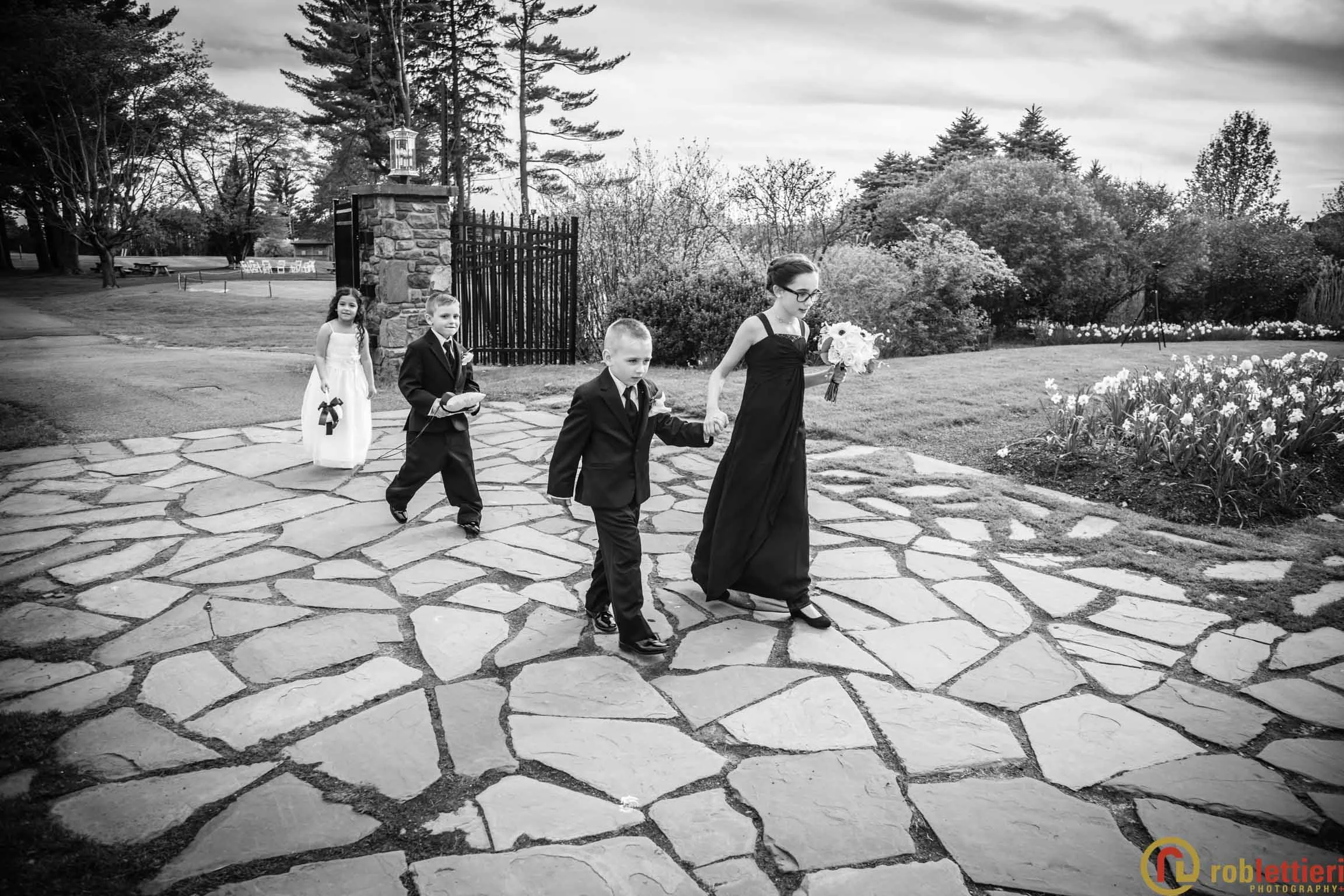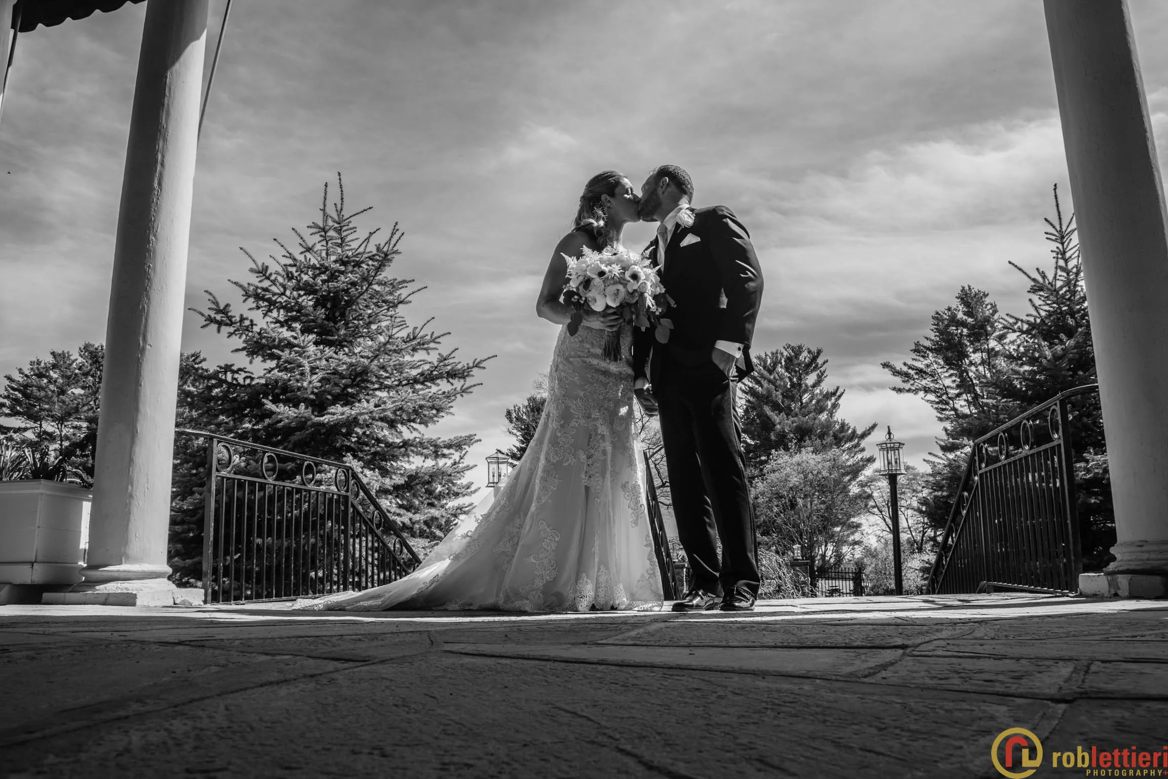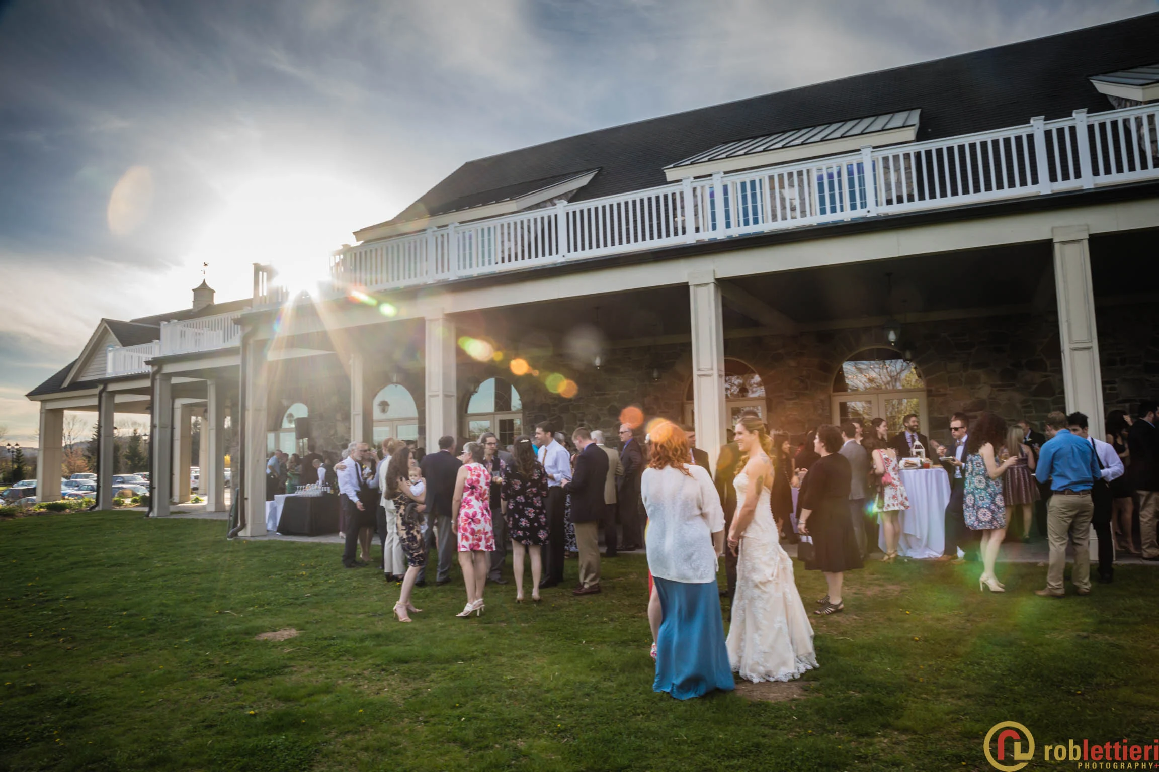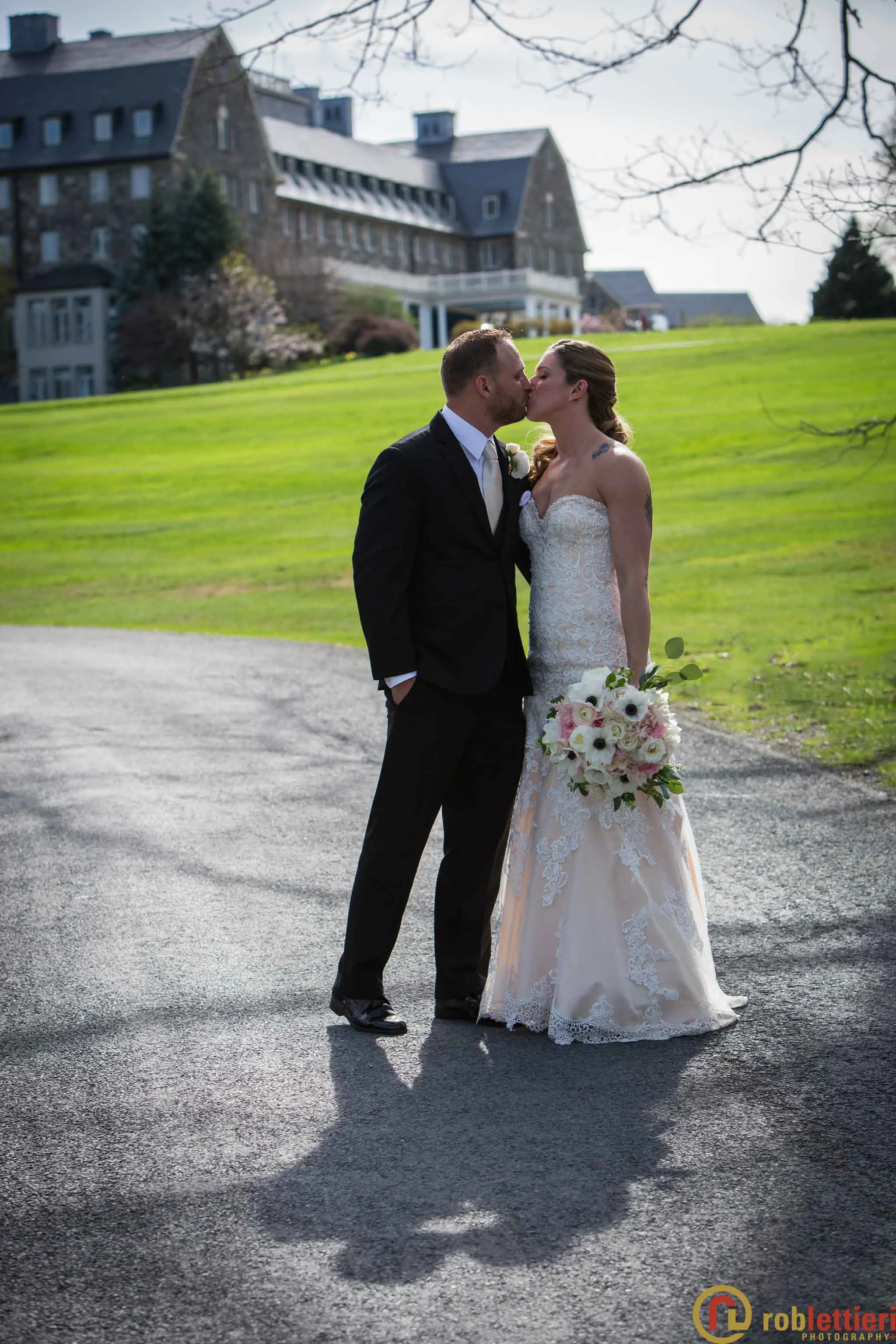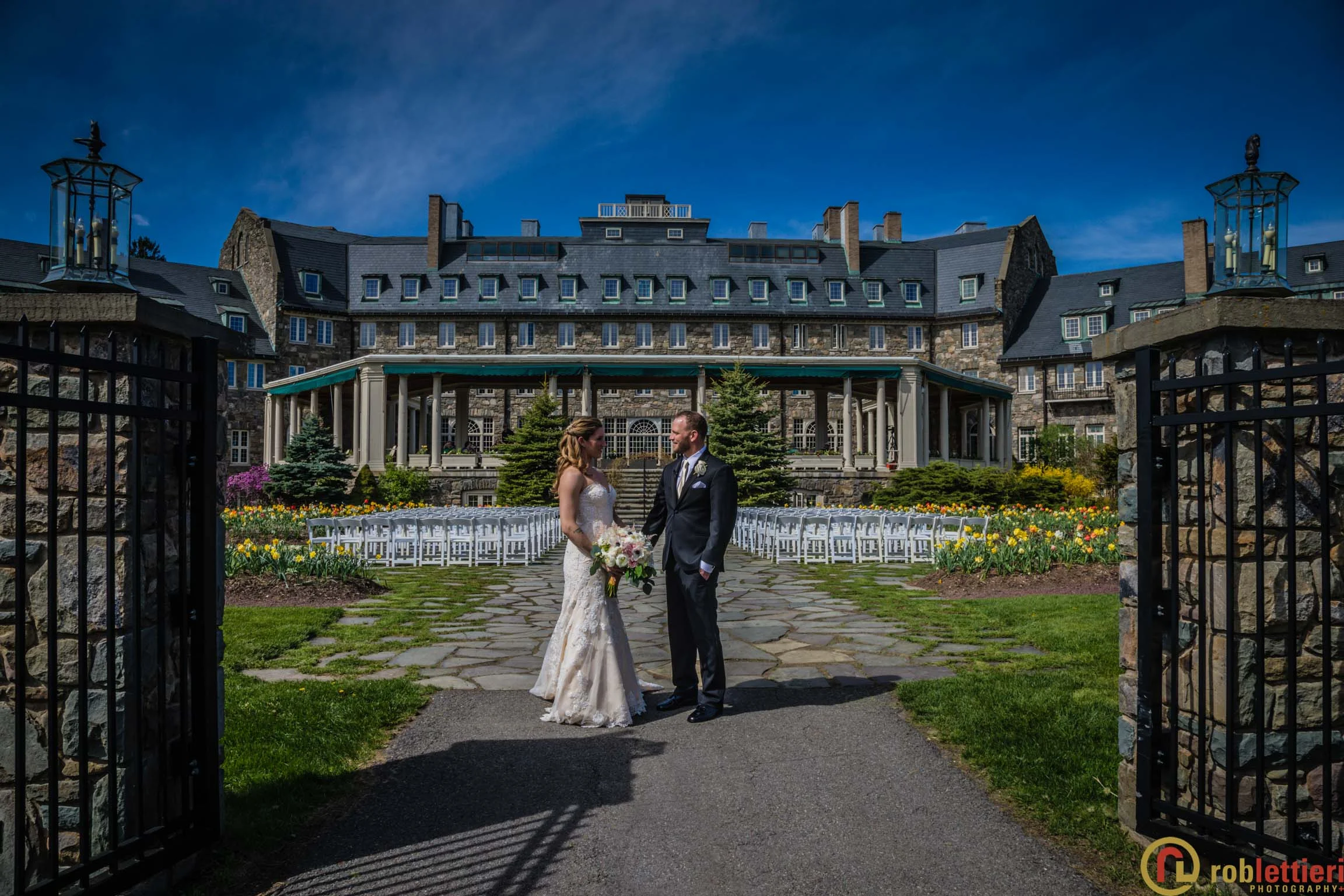 The patio marriage ceremony was set in the Formal Garden against the porch backdrop among a plethora of tulips on all sides. Cocktails followed on the Evergreen patio outside the ballroom. DJ Marquis from Philadelphia orchestrated the festivities, before during and after a great dinner with toasts and various dances.